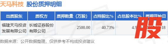 证券之星消息,天马科技(603668)9月19日公开信息显示,股东福建天马投资发展有限公司向长城证券股份有限公司合计质押2500.0万股,占总股本4.98%。质押详情见下表: